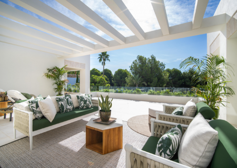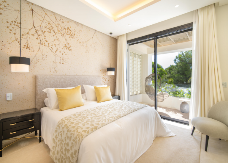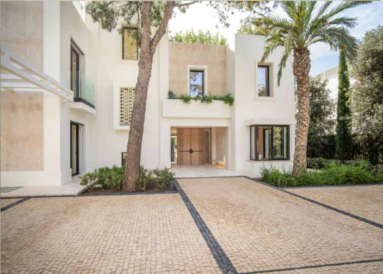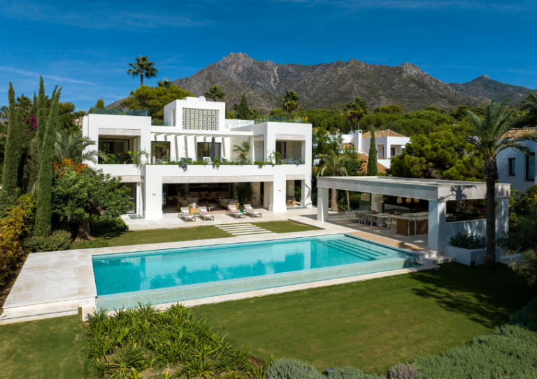 La arquitectura de la propiedad, diseñada por Francisco Guillén, es sinónimo de elegancia moderna, con un exterior blanco, una distribución simétrica y adornos verdes. Desde el jardín se pueden disfrutar vistas a la montaña La Concha. Los interiores, diseñados por Pedro Peña, son igualmente impresionantes, con una refinada selección de muebles y acabados que combinan estética y confort.
