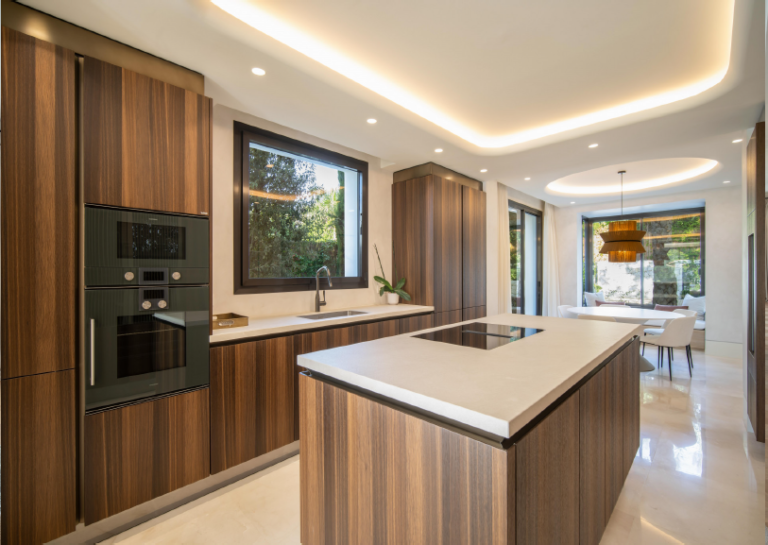 La cocina a medida desprende elegancia y funcionalidad. El impresionante contraste de madera oscura adorna la isla de la cocina y los armarios, mientras que el suave mármol crema en la encimera aporta un toque relajante. Con amplios espacios de almacenamiento y superficie de trabajo, es una cocina moderna, increíblemente funcional y un sueño para aquellos que disfrutan del arte de cocinar. Un pequeño comedor integrado en la cocina es el lugar ideal para las comidas diarias.